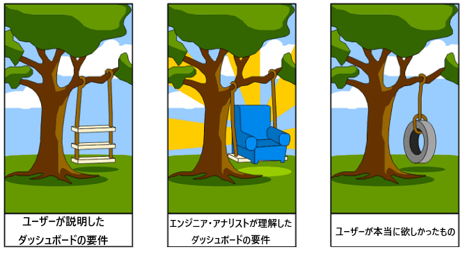 ダッシュボードをつくるのは難しい。「自分が本当に欲しいダッシュボード」を説明できるユーザーはめったにいない。本当に欲しいダッシュボードの要求定義を聞き出せるアナリスト・エンジニアだってそんなにいるものではない。本当に欲しいものが何か説明できないユーザー、理解する能力のないアナリスト・エンジニアのやり取りの結果生まれるダッシュボード。古典的な「顧客が本当に欲しかったもの」の図式とそっくりである。