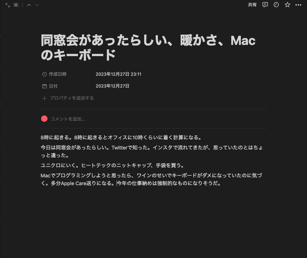 日記自体は単純な構造で、プロパティは日付しかない。下記の画像は今月のとある日の日記である。