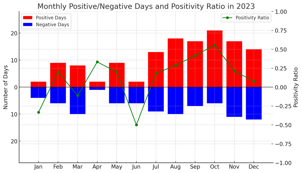 次に、月毎の「ポジティブな日」と「ネガティブな日」の分布を示す。以下の定義で示される「Positivity Ratio」もプロットした。