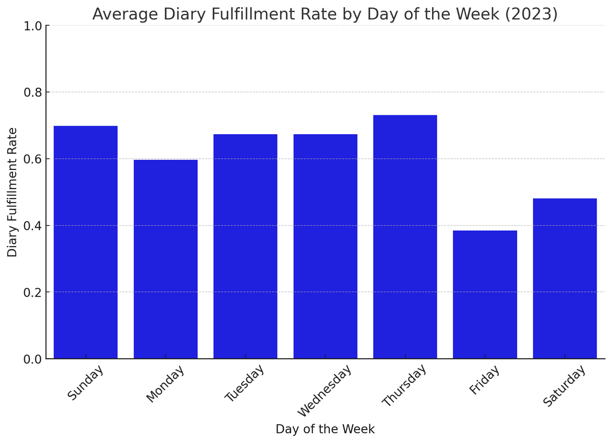 ちなみに、曜日単位での日記充足率は以下のようになった