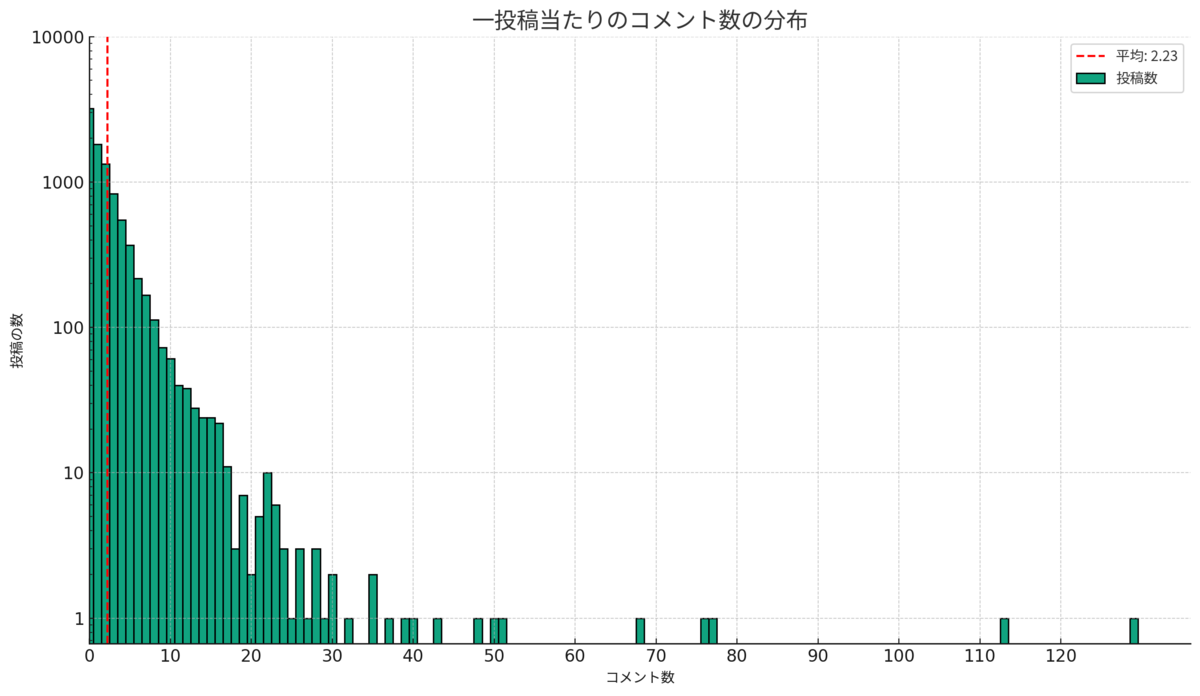 次に、一つの投稿ごとのコメント数の分布を対数グラフで見てみる。