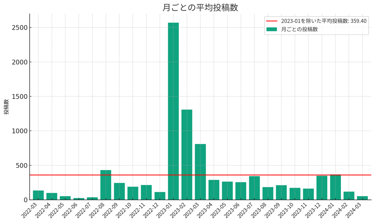 - 2023-01を除くと、月ごとの平均投稿数は359件程度であり、一日当たり平均10件程度投稿されている計算になる。