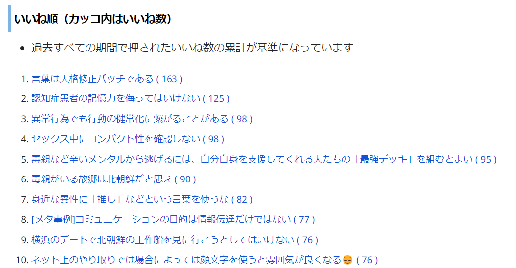 | 70 | その性癖をここで開示しなきゃ始まらないぞ | 飲み会での下ネタトークでアクセルを踏みすぎてはならない | https://healthy-person-emulator.org/archives/32133 |
